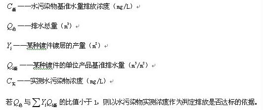 在企業的生產設施同時生產兩種以上產品、可適用不同排放控制要求或不同行業國家污染物排放標準,且生產設施產生的污水混合處理排放的情況下,應執行排放標準中規定的最嚴格的濃度限值,并按公式(1)換算水污染物基準水量排放濃度: