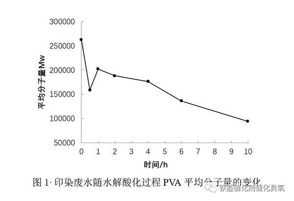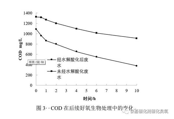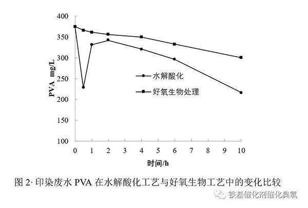 對于一些高聚物,在水解酸化段比在好氧生物段,“水解”作用進行得更充分,即“大分子變為小分子”,由此可生化性提高。如我們的研究,水解酸化處理實際印染廢水中的PVA(聚乙烯醇),對降低聚合度有顯著的作用,如圖1;而好氧生物處理工藝對PVA的降解,明顯弱于水解酸化過程,如圖2;經過水解酸化預處理后,好氧生物處理去除有機物的效果明顯提高。